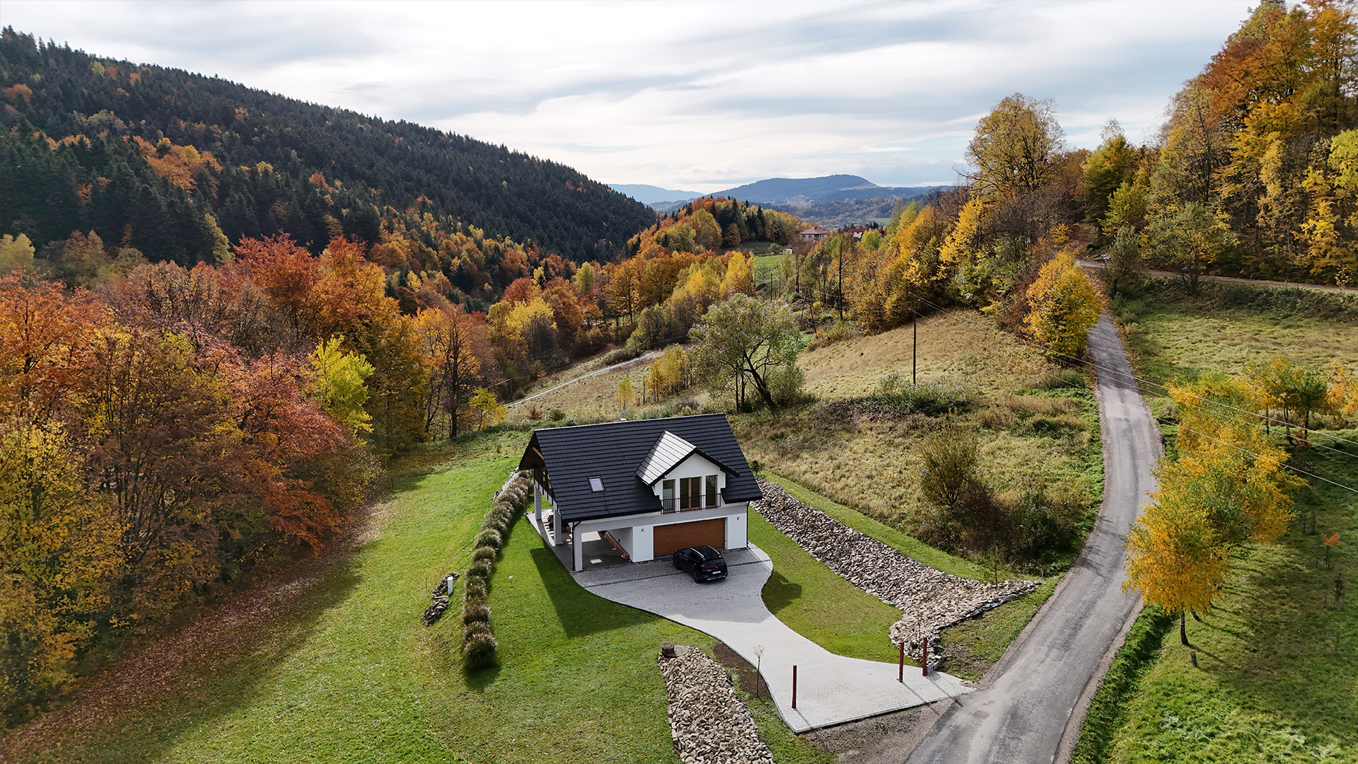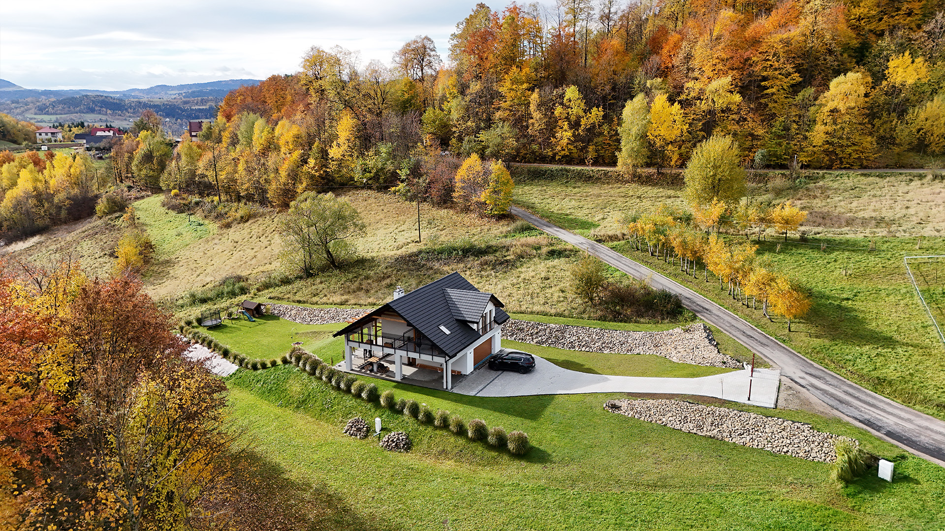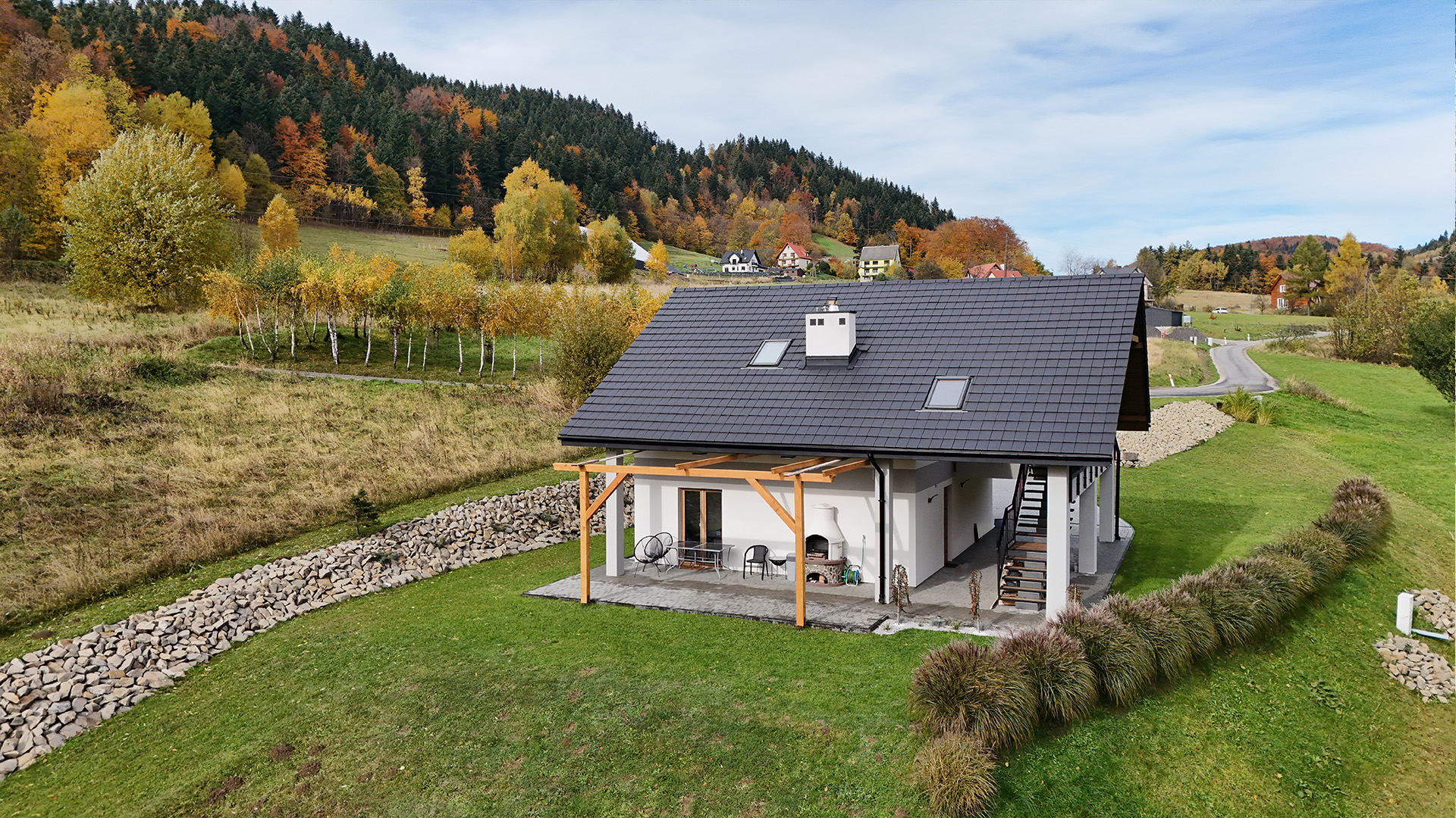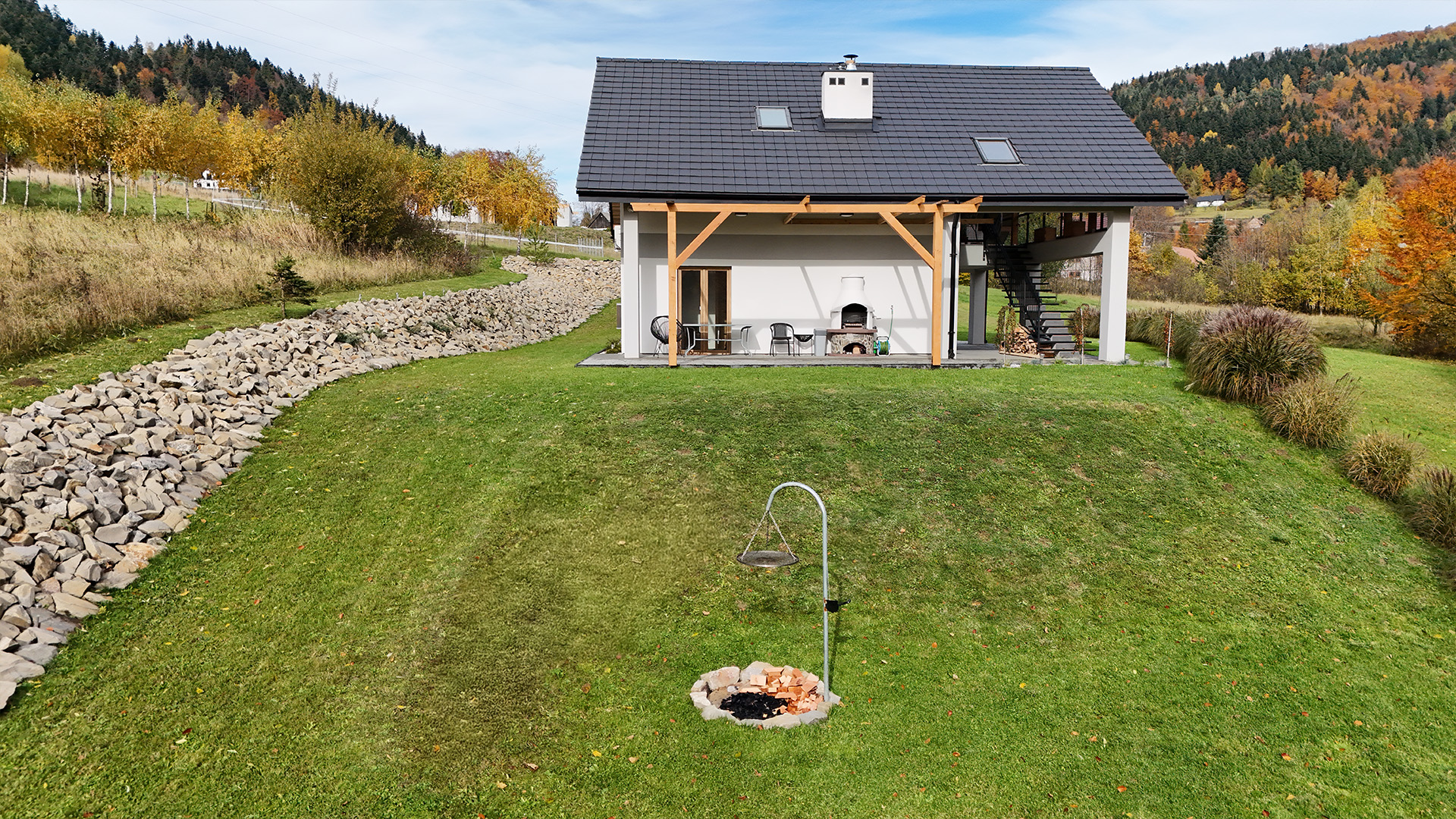 Czas zobaczyć Dom za Górą na własne oczy! Poniższa galeria prezentuje bardzo wysoki standard wykończenia każdego pomieszczenia oraz piękno otoczenia. Przygotowaliśmy dla Państwa szczegółowe ujęcia wnętrz, ogrodu, paleniska i najbliższej okolicy.