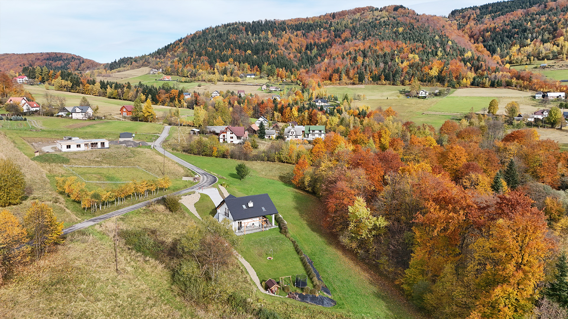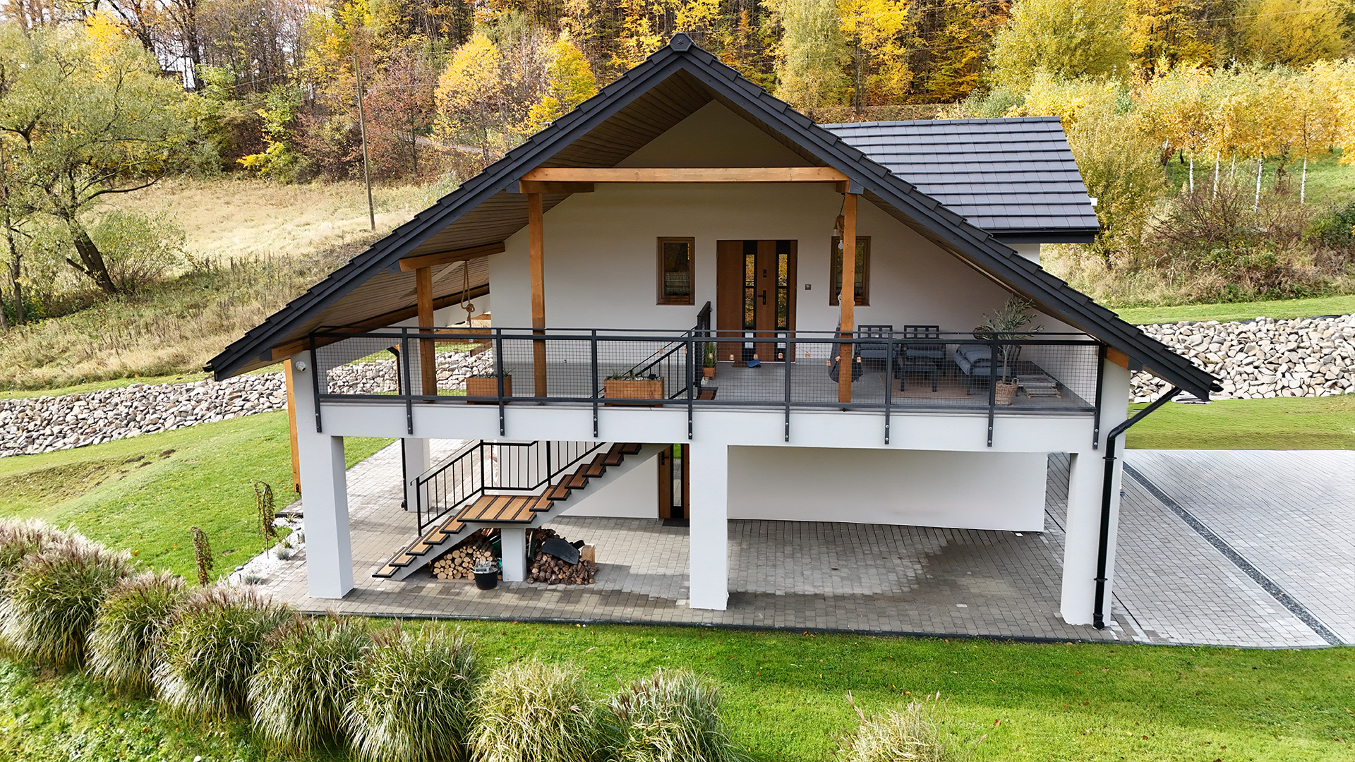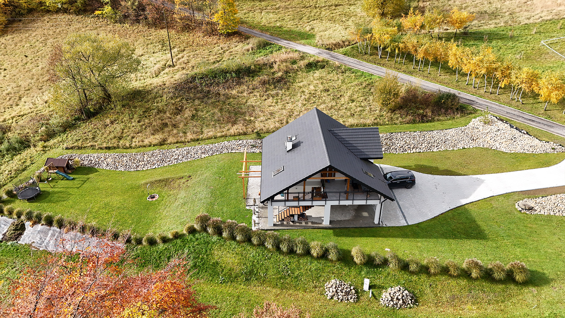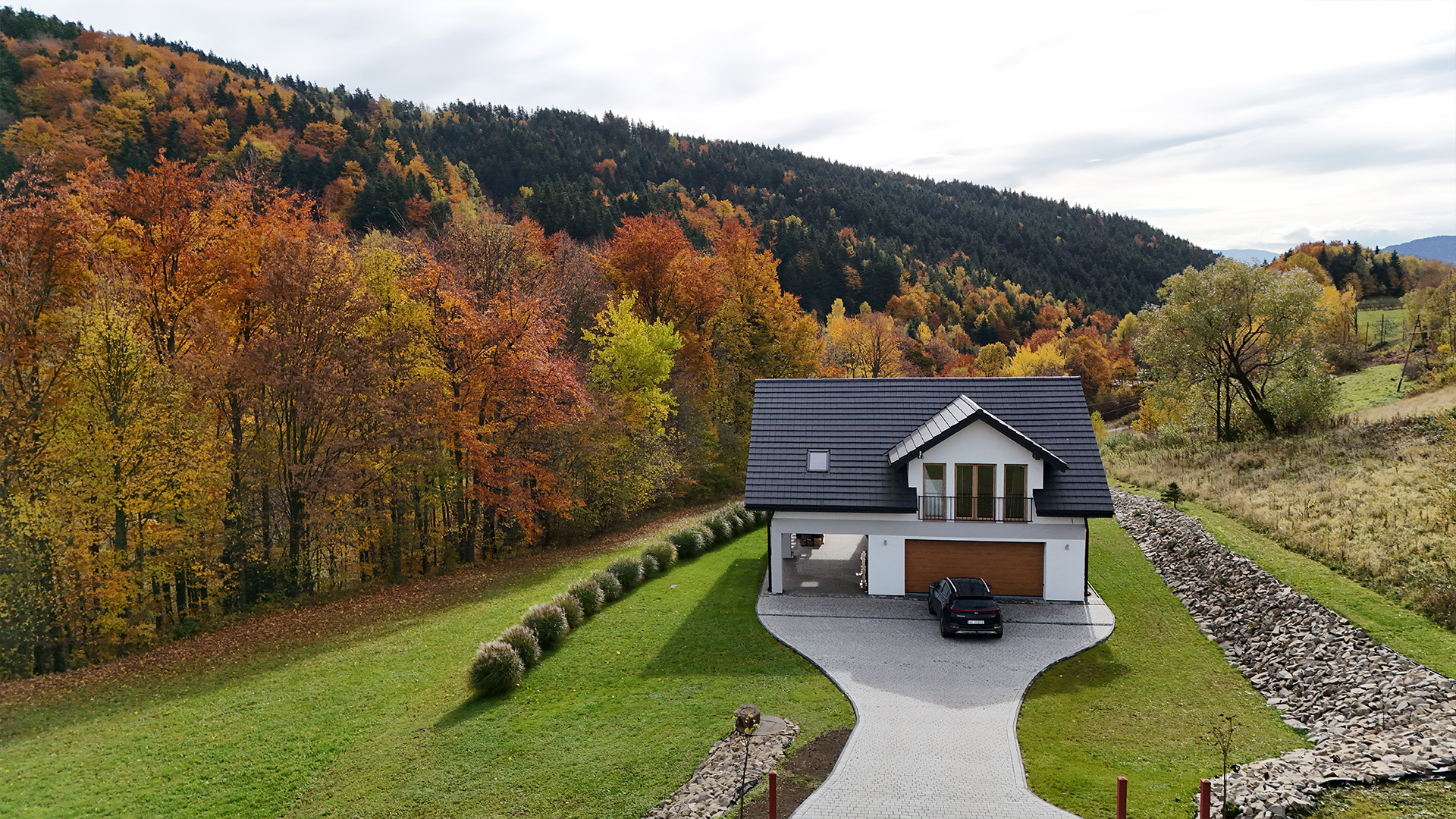 Czas zobaczyć Dom za Górą na własne oczy! Poniższa galeria prezentuje bardzo wysoki standard wykończenia każdego pomieszczenia oraz piękno otoczenia. Przygotowaliśmy dla Państwa szczegółowe ujęcia wnętrz, ogrodu, paleniska i najbliższej okolicy.